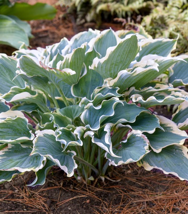 A ruffled hosta that will bring joy year after year. Heart-shaped, blue leaves have crisp, creamy white edges. Near white flowers.