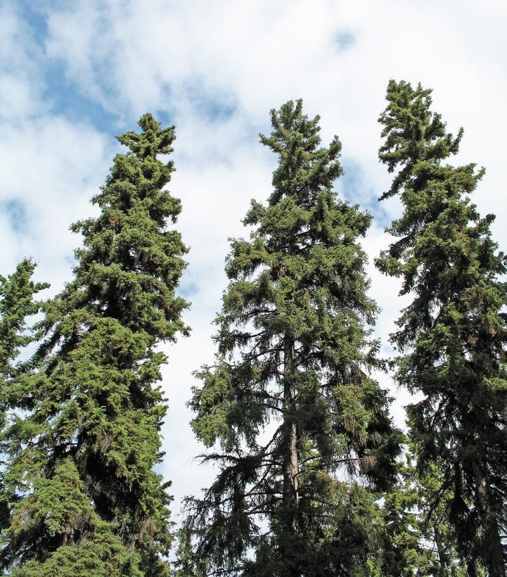 Picea glauca is a large evergreen with thin, flaky bark, and cylindrical bale brown cones. Needles are blue-green in color, half-inch long, and are quite aromatic when crushed. Find this tall conifer in upland areas and near lakes and streams.