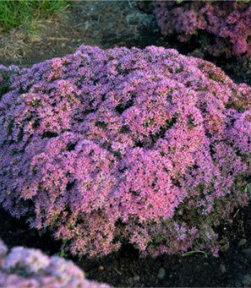Forms a low, rounded mound in spring, growing to just under 1' tall by summer. Dark green leaves become covered in a dome of dark pink flowers followed by pretty seed heads.